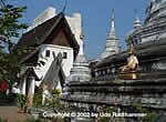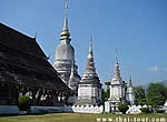 Přestože Chiang Mai dosahuje jen zlomku rozlohy Bangkoku, může se pochlubit téměř stejným počtem chrámů (více než 300, jenom za hradbami na území starého města je jich 121 a v celé provincii pak víc než 1000). Vznikly převážně během největšího rozkvětu města - od 13. do poloviny 16.století, kdy bylo Chiang Mai předním náboženským centrem. Z té doby se dochovalo mnoho chrámů, i když valnou část z nich pozměnili v různé míře Barmánci, kteří město několikrát ovládli. Přesto je místní architektura považována za typickou ukázku lannského stylu, který se vyznačuje mimo jiné umně propracovanou dekorací sloupů a dveří budov v chrámech. |
