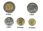 Obíhají v hodnotě 1, 5 a 10 THB. Thajský bát se dále dělí na méně běžné drobné mince v hodnotě 25 a 50 satang. 1 THB = 100 satang.